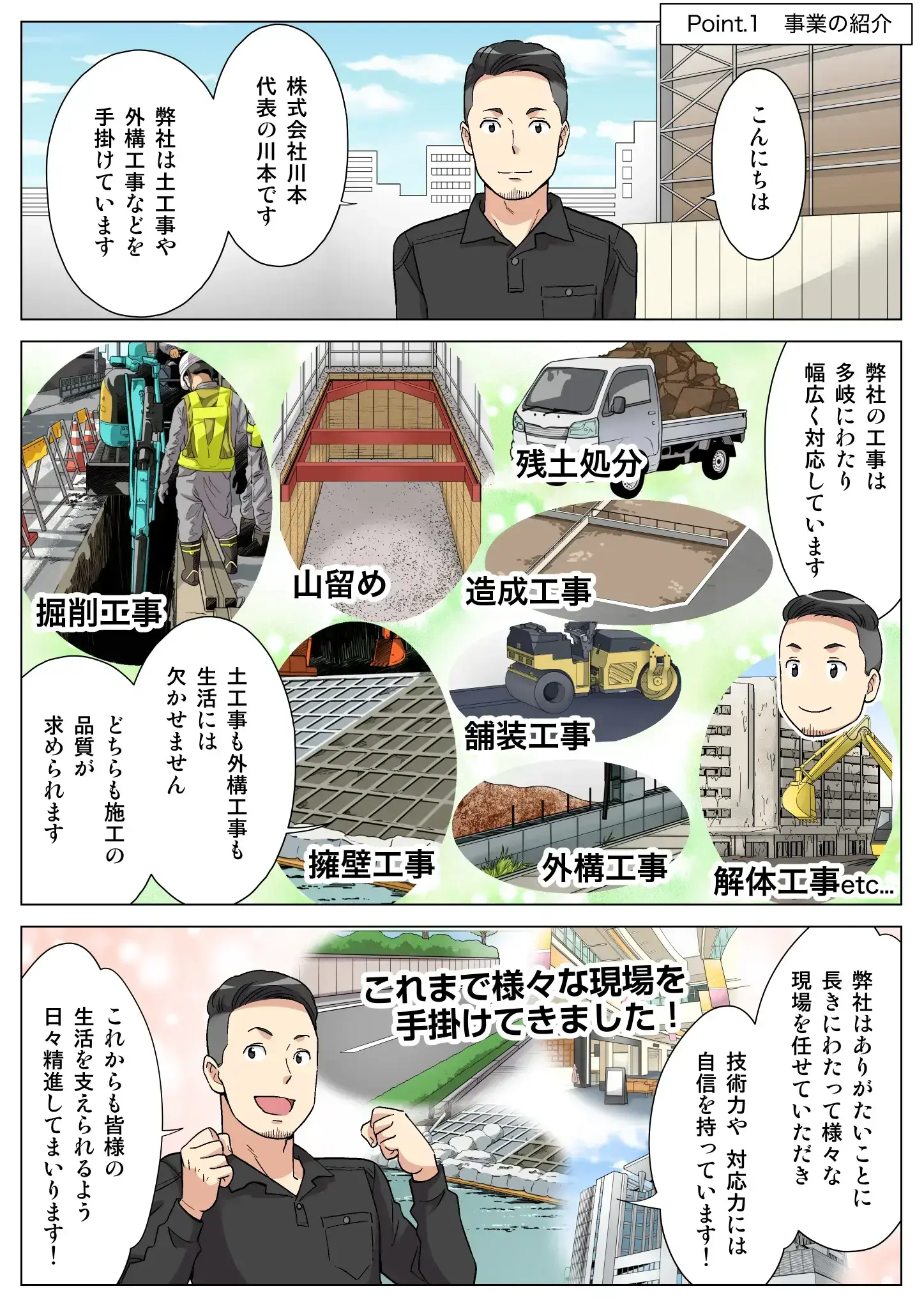 こちらでは、株式会社川本を漫画でご紹介しています。漫画を通じて、会社のこれまでの歩み、事業内容、採用について知ることができます。写真や文章ではなかなか伝わらない部分も、イラストを使って分かりやすくご紹介していますので、ぜひご覧ください。
